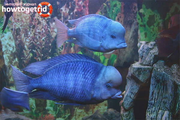 Le dauphin bleu (Cyrtocara moorii) doit être attribué aux cichlidés d'aquarium. Il venait du lac africain du Malawi. Sa popularité est principalement due à la couleur et à la forme inhabituelle du corps, sur lesquelles se trouve un gros cône gras. Il est très difficile d'appeler ce représentant très petit, car il peut grandir en captivité jusqu'à 25 cm, parfois les tailles peuvent aussi prendre de grandes tailles. Les poissons sont paisibles, mais les mâles sont assez agressifs et se battent souvent entre eux.