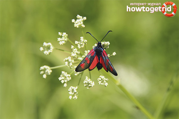 - Meadowsweet hétéroclite. Cette espèce a la plus grande distribution. Les ailes avant sont noires.Un léger éclat métallique est caractéristique. De grandes taches de couleur rouge vif sont situées sur les ailes. La chenille papillon est de petite taille avec un corps dense couvert de poils. La chenille est capable d'accumuler des cyanures. Si l'un des animaux l'avale, il peut simplement être empoisonné.