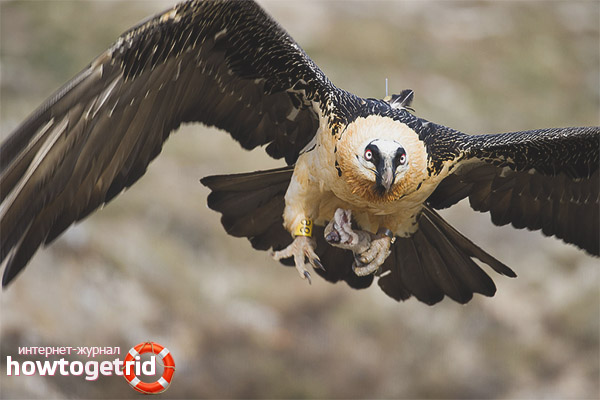 - Le prédateur attaque la proie par l'arrière, puis commence à battre des ailes en forme d'éventail et étourdit littéralement le jeu. Inflige les derniers coups et essaie le plus tôt possible de pousser la proie dans l'abîme. En règle générale, ces combats se terminent par la mort, après quoi l'homme barbu peut prendre un repas en toute sécurité.