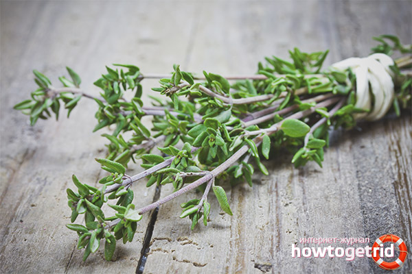 En cas d'irritation cutanée, d'eczéma, appliquez des bains à base de thym. Pour cela, 3 cuillères à soupe. cuillères à soupe d'herbe versez 6 tasses d'eau bouillante et insistez pendant une heure. Ces bains désinfectent la peau, soulagent les irritations.