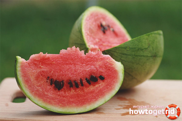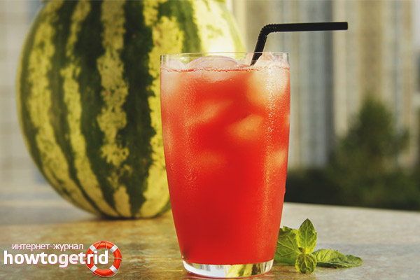 Contre les brûlures d'estomac et la lourdeur dans l'estomac ne fait pas de mal à boire une tasse de nectar de pastèque. Il doit être bu une demi-heure avant un repas ou dans les intervalles entre le petit-déjeuner et le déjeuner, le déjeuner et le dîner, par exemple, pour restaurer le corps des effets d'un repas copieux. Le jus réduit l'œdème, élimine les calculs rénaux, rétablit l'équilibre eau-sel, élimine la constipation et les dépôts de sel dans le squelette et économise les toxines pendant les cours de chimiothérapie.