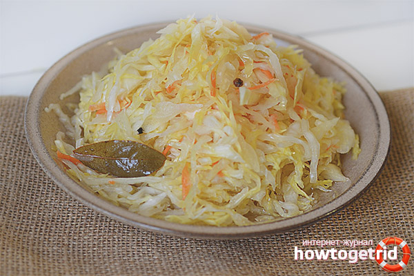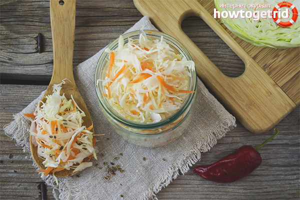 La teneur en acide folique du chou garantit une régénération accélérée et un grand pourcentage des vitamines B restantes aide les intestins à travailler, aidant à digérer complètement les aliments, y compris la viande grasse et les délices fumés, sans aucune conséquence particulière. La choucroute est souvent utilisée comme plat indépendant ou comme plat d'accompagnement lors d'une fête festive.