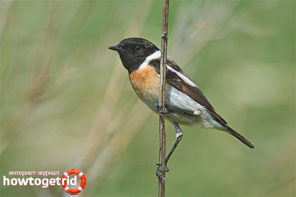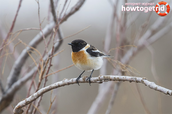 - Rubicola préfère vivre dans une zone sèche, inondée de lumière suffisante. Les mâles par leurs données externes sont déterminés tout simplement. Ils se caractérisent par un cou blanchâtre et une poitrine rougeâtre. La tête est noire, ce qui vous permet de séparer cette espèce, par exemple, des représentants des prairies. Les femelles, ainsi que les jeunes et les mâles en plumage printanier diffèrent de la zone claire semblable à soi au-dessus de la queue et des sourcils de la même teinte.