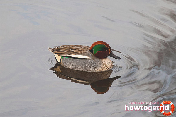 Très souvent, des oiseaux peuvent être trouvés en compagnie de canards colverts. Ce n'est pas un hasard, car les oiseaux ont les mêmes lieux de nidification. Extérieurement, ils sont difficiles à confondre les uns avec les autres, car les sarcelles ont certains plumes verdâtres de plumage sur les ailes, qui sont si lisses qu'elles brillent même.