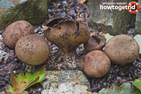 Il ne peut pas être mangé. Ceci est un faux imperméable. Il fait partie de la famille des sclérodermies. Ils sont caractérisés par la croissance de la famille, et vous pouvez les trouver dans la forêt de feuillus. Le terrain plat de prairie est un endroit préféré pour leur croissance. Ils préfèrent être dans les hautes herbes. Ils commencent à croître au cours des dix premiers jours d'août et ne poussent qu'à la mi-automne. Le diamètre du fruit est de 3 à 5 cm, il a la forme d'un tubercule brun. Il est recouvert d'une coque extérieure à caractère de liège.