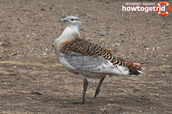 - N'oubliez pas que ces individus sont de taille assez importante.De plus, ils ont un long cou et aucun plumage sur les pattes. Le plumage a souvent des nuances rouges et blanches. En raison de cette couleur, les oiseaux se confondent avec le terrain. Il leur est plus facile de se cacher des prédateurs. En outre, les outardes ressemblent à des autruches à certains égards, mais beaucoup moins.