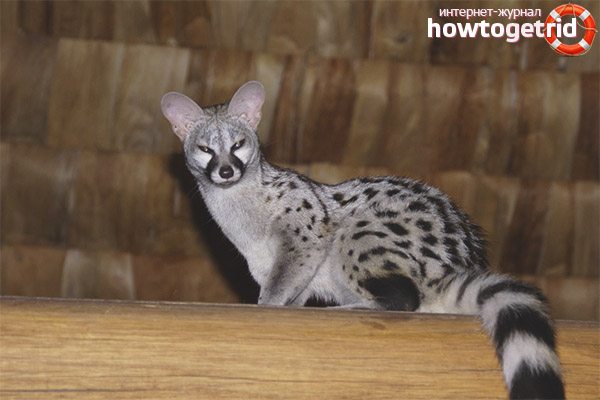 - Tiger geneta se distingue par une couleur jaune clair sur le dessus du dos, qui devient progressivement gris. La queue a des rayures claires, alternant avec des plus foncées et se terminant par une pointe complètement noire.