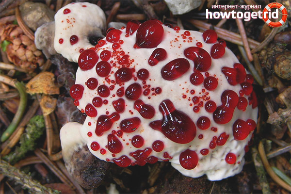 - Nous passons directement à la description du champignon lui-même. Il est blanchâtre avec une légère teinte rose. Le chapeau est velouté, a un format intéressant avec des emmanchures et des coudes. Sur les creux, certains points sont observés, semblables à des gouttes de teinte rouge. Le fluide sort par les pores. Ces baisses dans certaines catégories d'individus sont associées à des traces sanglantes. Au fil du temps, une sorte de croissances similaires aux dents se forment sur les bords du champignon. C'est à cause de cette caractéristique que le champignon a été appelé une dent qui saigne.