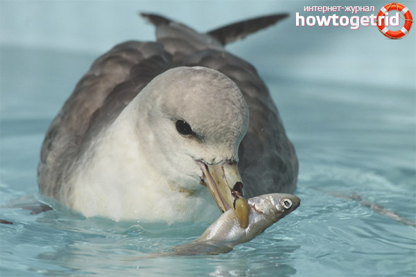 Pour les proies, les fulmar partent en mer, mais ils ne le font pas à la volée, mais en descendant à la surface de la mer. Pour attraper un poisson ou quelque chose de comestible, les oiseaux plongent littéralement sous l'eau, plongeant la tête dans les yeux.Dès qu'un imbécile est attrapé, il l'attrape instantanément avec son bec, après quoi il l'avale immédiatement complètement.