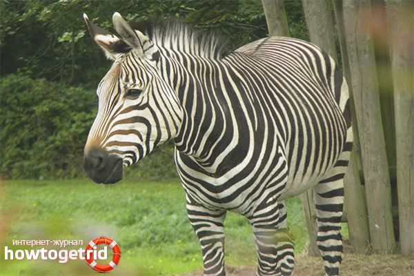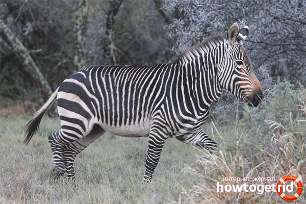 Contrairement à un zèbre plat, le zèbre de montagne n'a pas non plus de «rayures d'ombre» et les rayures ne se rencontrent pas sous l'estomac. Au lieu de cela, il est blanc avec une bande noire centrale. Cependant, les caractéristiques les plus diagnostiques de cette espèce sont le motif "à mailles" de rayures étroites le long de la croupe et d'un lambeau carré de peau, ou sous-poil, qui existe sur la gorge de ce zèbre. Mountain Zebra est un bon grimpeur sur un terrain escarpé et rocheux. Elle a développé des sabots très pointus et rigides. Longueur du corps - jusqu'à 250 cm, longueur de la queue - 40-50 cm, hauteur des épaules - 116-150 cm, poids - 240-372 kg.