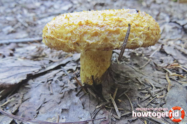 - Si vous exercez une pression sur le chapeau, il changera de couleur pourpre. Les plaques sont situées à proximité les unes des autres, elles sont étroites et tombent à la base. Ils sont peints en jaune, mais deviennent bleus lorsqu'ils sont pressés. Une base de forme ronde, mince au début, atteint jusqu'à 8 cm de hauteur pour une épaisseur de 3 cm.