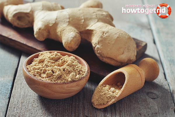 - Mélanger dans une tasse de 120 ml. jus de gingembre frais et 25 gr. poudre de la racine de la plante. Protégez vos mains avec des gants de cellophane. Appliquer une composition homogène avec des mouvements de massage sur la tête.