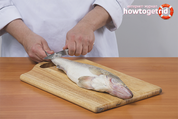 - L'étape suivante consiste à nettoyer le poisson des écailles. Pour ce faire, prenez un grand couteau bien aiguisé. Plus le couteau est gros, plus il est facile à nettoyer. Mettez le poisson sur une planche à découper, saisissez la queue d'une main. Avec la seconde main avec un couteau, débarrassez le poisson des écailles en les faisant glisser de la queue vers la tête, c'est-à-dire contre l'emplacement des écailles.