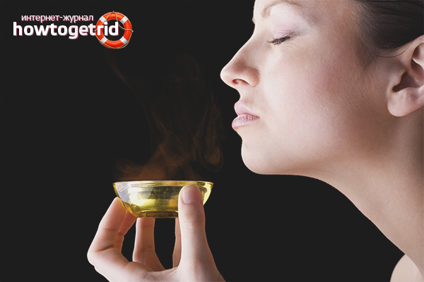 - L'inhalation. Il est très efficace de respirer de l'air chaud, qui désinfecte la cavité nasale de l'intérieur, affectant le virus. Si vous ajoutez des huiles essentielles de menthe poivrée et d'eucalyptus au liquide d'inhalation, cela vous aidera à vous débarrasser immédiatement du gonflement de la muqueuse. Pour restaurer la capacité de capturer les odeurs et les goûts, vous pouvez faire la composition suivante pour l'inhalation. Préparez une décoction de calendula, ajoutez du jus de citron, de l'huile essentielle de menthe poivrée et un peu de cumin. Inspirez les fumées du bouillon préparé - elles sont très utiles à la fois pour restaurer l'odorat et contre le rhume.