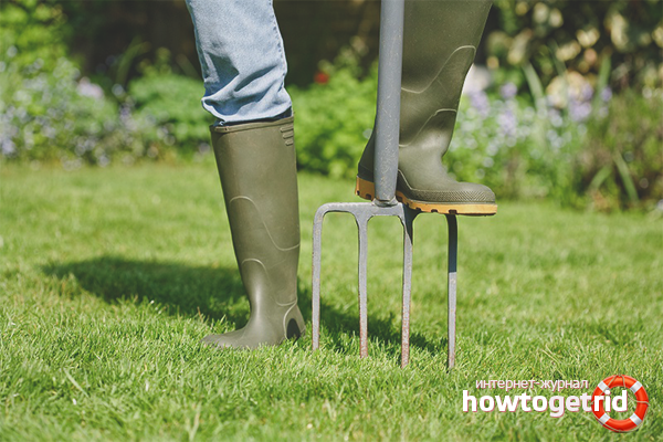 - Aération. Si vous ne vous occupez pas correctement de la pelouse, au fil du temps, l'herbe poussera si densément qu'elle bloquera l'accès à l'air et à l'humidité. Dans cette zone, la mousse est garantie d'apparaître. Pour éviter cela, il est nécessaire de procéder à une aération. Cela peut être fait à l'aide d'une machine spéciale qui déterre de petites parcelles de terrain. Cela peut être fait manuellement, par exemple, à l'aide d'une fourche ou d'un râteau. L'aération aide à faire tomber la croûte au sol et à fournir au sol les nutriments essentiels. La procédure doit être effectuée avant ou après la saison de croissance.