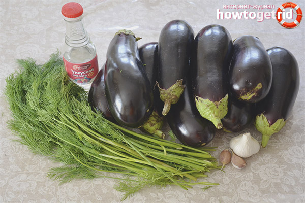- Selon cette variante, la collation sera réalisée en une seule pièce. Vous aurez besoin d'environ trois branches de basilic et de la même quantité de persil, vous pouvez un peu plus. Il est également nécessaire de prendre quelques têtes d'ail, du sel avec du sucre en quantité de 20 g., De l'eau (2,6 litres), 0,1 litres. vinaigre, plusieurs feuilles de laurier, aubergine en quantité de 2 kg., quelques parapluies à l'aneth.
