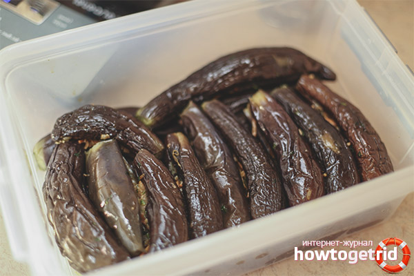 - Après une heure, mélanger les tomates avec l'aubergine. Ajoutez ici l'ail et les autres épices passées dans la presse. Frire tout dans l'huile, puis emballer dans des conteneurs. Versez le vinaigre et essorez.