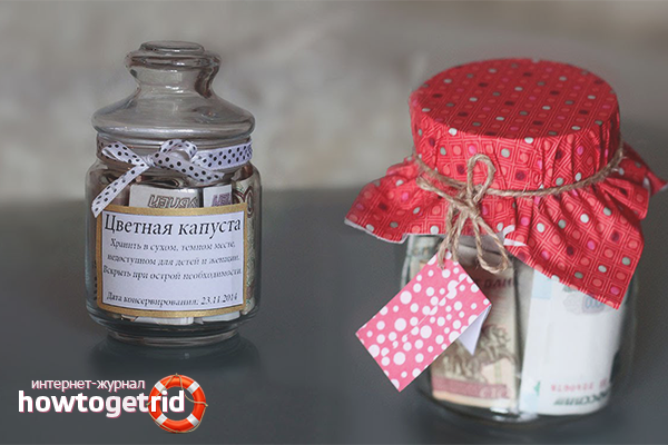 Pour que le pot soit beau, enveloppez-le de parchemin ou d'un chiffon baggy. Faites une étiquette que ce magasin est le plus fiable, afin que les jeunes mariés ne puissent pas se soucier de leur argent.