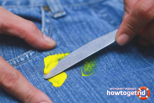 Si vous avez taché votre garde-robe préférée avec de la peinture à l'huile, utilisez cette recette. Tout d'abord, essayez de gratter le pigment avec un couteau, une brosse ou un autre objet pointu. Après cela, graisser la tache avec une composition grasse (gelée de pétrole, saindoux, huile végétale, etc.) pour adoucir la peinture. Humidifiez le chiffon avec du solvant industriel ou du white spirit, essuyez la tache en commençant par les bords. Vous pouvez utiliser du dissolvant pour vernis à ongles ou de l'acétone pure, mais ces produits ne garantissent pas 100% du résultat dans le cas de vieilles taches.