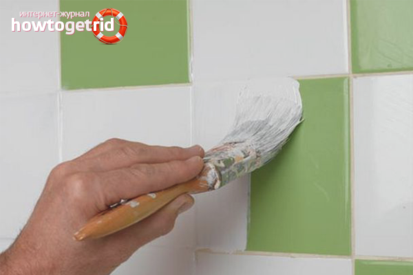 Les murs et les joints sont traités avec un matériau de peinture et laissés à sécher pendant 12-14 heures. Le lendemain, la tuile est repeinte.Il faudra au moins 2 couches d'émulsion pour cacher l'ancienne couleur de la tuile et des motifs.