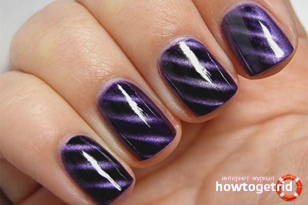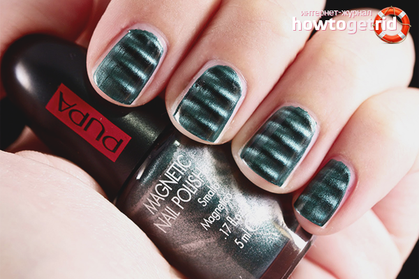 - Un revêtement de ce type a une composition stable, il adhère bien aux ongles, donc un agent de fixation (vernis de finition) n'est pas nécessaire. L'émail magnétique est éliminé par le liquide le plus ordinaire sans acétone, sans laisser de trace.