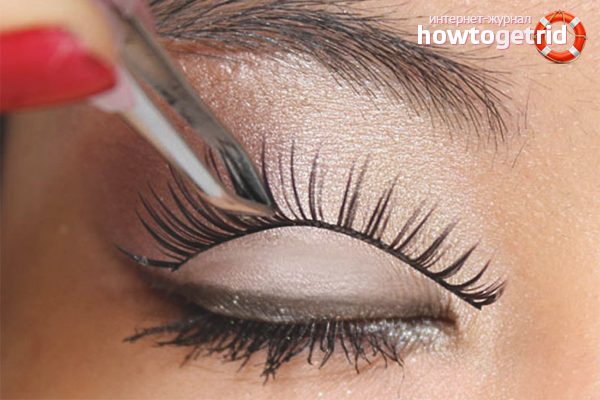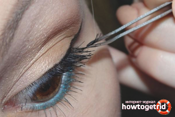 - Vous devez maintenant coller des cils artificiels. Prenez un tas de pincettes et trempez dans de la colle. Soulevez la paupière mobile avec vos doigts pour que vos cils natifs soient légèrement amincis. Attachez un paquet entre les poils naturels, commencez la procédure de l'intérieur de l'œil. Cure-dent avec un bord tranchant cassé, appuyez sur les cils artificiels à la base, attendez 2 minutes.