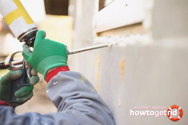 Avant le travail, nettoyez soigneusement la surface, humidifiez avec de l'eau (mais cela ne convient pas pour l'hiver, car le liquide se transforme en croûte de glace). Fixez la buse du pistolet à la couture à sceller et appuyez sur la gâchette. Faites-le en douceur et réglez la vitesse de sortie de mousse souhaitée avec la vis de réglage. Ne tirez pas la buse hors de la mousse et essayez de ne pas exercer de pression forte sur la valve - cela entraînera des coutures inégales, ainsi que l'apparition de vides et de déchirures, qui sont alors presque impossibles à niveler. Remplissez de larges coutures verticales de bas en haut - pendant que vous vous déplacez plus haut, la mousse se dessèche du bas et crée un support; de gauche à droite.