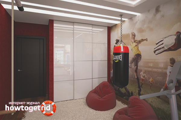 Il est possible d'équiper un mur de sport dans la chambre des enfants avec une barre horizontale, des escaliers, des anneaux de gymnastique et un sac de boxe.Un tel complexe contribuera au développement physique global de l'enfant, et dirigera l'énergie infatigable de l'enfant dans la bonne direction.