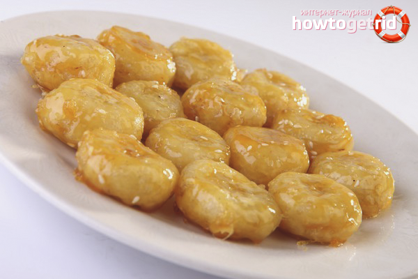 - Envoyer les fruits dans une poêle chaude avec de l'huile, les faire frire jusqu'à ce qu'ils soient croustillants. Faites la manipulation à feu doux. Retirez la friandise et placez-la sur une serviette.