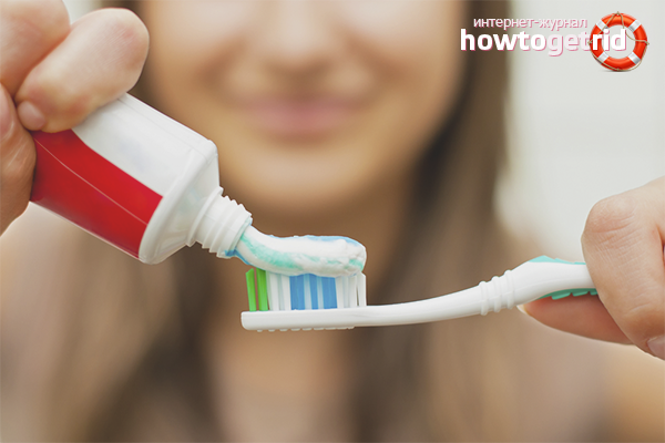 - Prenez une brosse à dents dans la main, rincez-la d'abord à l'eau bouillante, puis à l'eau à température ambiante. Après cela, appliquez une petite pâte de la taille d'un pois sur les poils. Il n'est pas interdit d'utiliser plus de produit de nettoyage, mais la mousse commencera alors à s'accumuler dans la bouche, créant des désagréments.