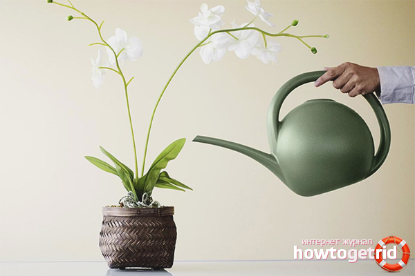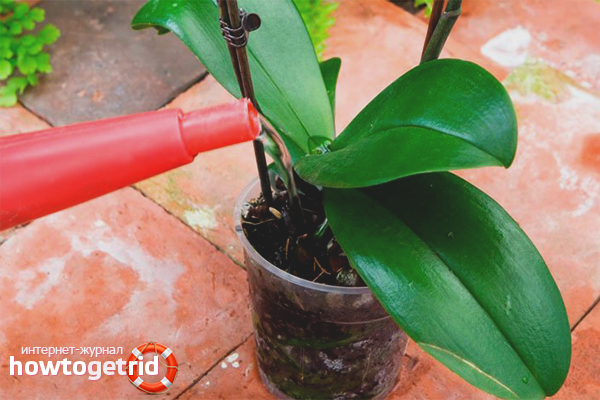 Maintenant, afin de ne pas causer de problèmes, nous allons arroser correctement l'orchidée. La méthode la plus courante et la plus pratique est conçue pour saturer l'écorce du substrat d'humidité, et non la plante elle-même. Et cela permettra à l'orchidée elle-même de prendre autant de liquide que nécessaire pour le moment. Dans ce cas, la pourriture du système racinaire, et donc le développement de maladies fongiques, est exclue.