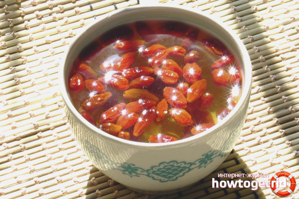 - Vous pouvez également faire du thé noir à partir de ces fruits. Pour une telle recette, vous avez besoin d'un quart de litre d'eau, 3 cuillères à café de goji. Il faudra 5 gouttes de jus de citron.Avant de préparer une telle boisson, vous devez rincer les baies et verser de l'eau bouillie. Ensuite, vous devez insister sur l'approvisionnement pendant un tiers d'heure. Après cela, l'infusion doit être filtrée et verser du jus de citron. Si vous le souhaitez, vous pouvez utiliser une boisson similaire sans interruption. Vous pouvez mettre du miel à votre goût.