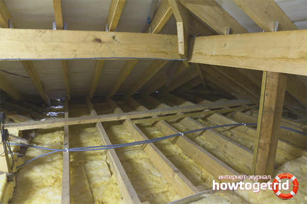 - Pose de l'isolant thermique. L'espace entre les poutres dans le grenier est rempli d'isolant et percuté. La hauteur totale de la couche dense doit être d'au moins 150 mm.