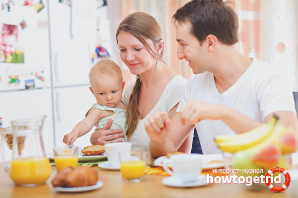 Un bébé qui a appris à se tenir la tête est assis à une table avec ses parents. L'enfant regarde papa et maman prendre le petit déjeuner et le dîner, et commence à s'intéresser à la nourriture pour adultes. L'enfant reçoit une cuillère en plastique ou un autre objet sûr dans ses mains, afin qu'il joue et s'habitue aux couverts.