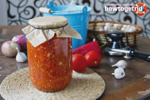 - Ramener la masse à l'apparition de bulles, laisser reposer 10 minutes. Laver les bocaux en verre avec de la soude, sécher. Emballez le produit fini dans un récipient, enroulez ou serrez les couvercles. Après refroidissement, déplacer l'adjika au réfrigérateur ou en cave.