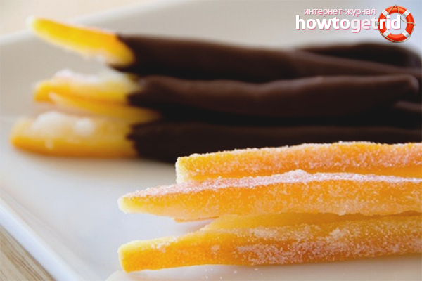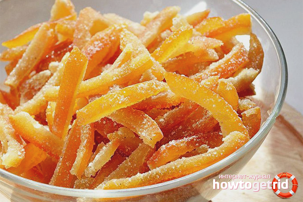 - Saupoudrer le zeste de sucre en poudre, laisser sécher les fruits confits à température ambiante pendant 4-5 heures. Vous pouvez accélérer le processus en utilisant le four. Placez la plaque à pâtisserie avec le contenu dans un four préchauffé à 70 degrés. Attendez 1,5 heures. La gâterie est prête à manger.