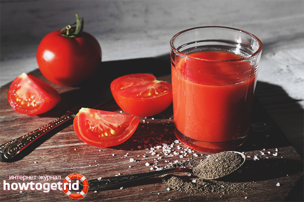 - La boisson est utilisée avec succès pour guérir les lésions cutanées. Il contribue à la désinfection des fissures et des plaies, améliore les processus de régénération, protège contre les facteurs externes. La compression des tomates est demandée en cosmétologie lors du blanchiment du visage contre la pigmentation, les taches de rousseur et autres imperfections.