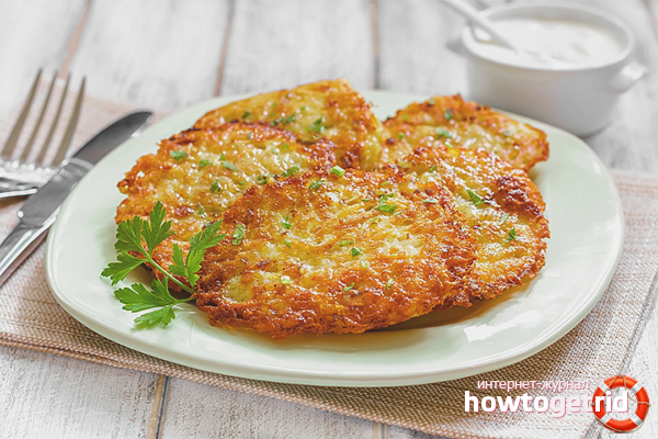 - Si après la cuisson des crêpes de pommes de terre se sont révélées être du «caoutchouc», cela vaut la peine d'ajouter un peu d'amidon ou de remplacer complètement la farine par celle-ci.