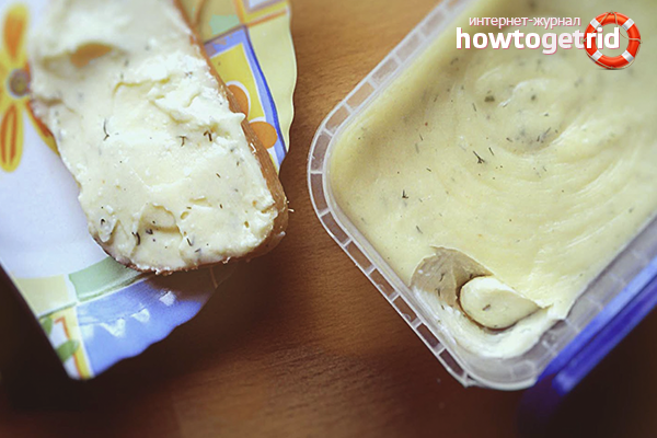 - Hacher le beurre en cubes, transférer dans un bol profond en verre ou en céramique. Micro-ondes sur le bord de la platine. Faire fondre complètement le produit, mélanger au fromage cottage.