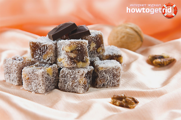 - Gardez le plaisir turc dans le froid pendant environ 7 heures avant de durcir. Après le temps imparti, coupez-le en tranches de 2,5 à 3 cm, roulez d'abord dans de l'amidon, puis dans des flocons de noix de coco.