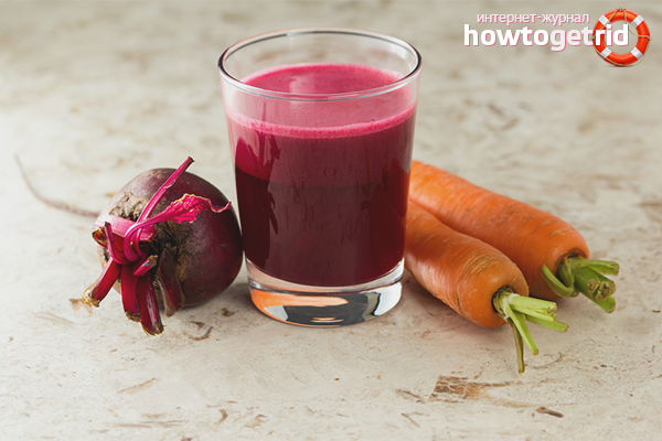 - Buvez du jus de carotte et de betterave 2 fois par jour, 100 ml chacun. une demi-heure avant le repas principal. Si la boisson est très concentrée, diluez-la avec de l'eau potable dans un rapport de 1: 1.