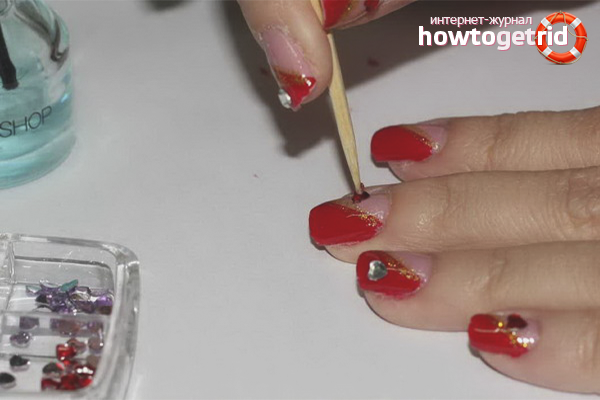 - Apportez à l'ongle, mettez au bon endroit, appuyez sur. Comme le vernis sèche en peu de temps, vous devez agir aussi rapidement. Répétez avec chaque strass suivant, puis passez à un autre doigt.