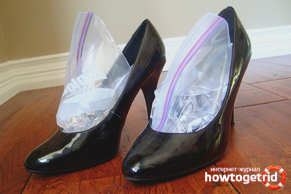 - De la glace. Tout le monde sait que l'eau se dilate lorsqu'elle gèle. Cela est visible dans la bouteille d'eau en plastique qui a été laissée dans le congélateur. De plus, cette expansion a lieu quel que soit le matériau, c'est-à-dire que la glace est capable de déplacer même la peau la plus dense. Verser de l'eau dans les chaussures est un plaisir douteux, nous le ferons donc. Nous aurons besoin de nouveaux sacs en plastique sans trous. Nous collectons l'eau dans un sac et la déposons dans une chaussure. Nous essayons d'arranger le paquet avec de l'eau afin que le liquide remplisse tout l'espace de la chaussure. Nous attachons bien le cou, puis mettons toute la structure au congélateur et le laissons pendant plusieurs heures. C'est un moyen réel et très efficace d'étirer les chaussures.