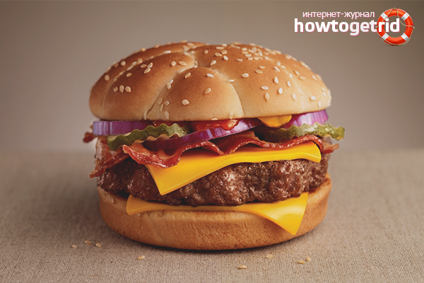 Nous chauffons la poêle et y faisons frire le bacon jusqu'à ce qu'elle soit dorée. L'huile est facultative. Nous commençons l'assemblage du hamburger - au fond du pain, nous mettons un morceau de bacon, puis un cercle de tomate, une galette. Ajouter les oignons et les concombres hachés sur le dessus. Si vous le souhaitez, vous pouvez graisser la côtelette avec de la mayonnaise, mais un tel hamburger sera juteux en raison du bacon. Nous finissons la composition avec du fromage et couvrons avec le deuxième côté du pain.