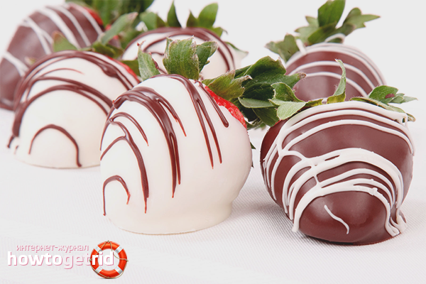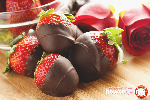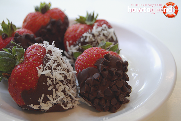 - Prenez les fraises par les sépales, faites-les tremper dans une masse de chocolat noir. Mettez sur une planche pour durcir. Broyez le chocolat blanc à ce moment, faites-le fondre sur la cuisinière.