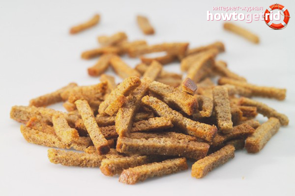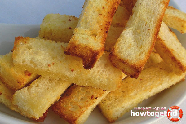 - Vous pouvez faire des crackers dans une casserole d'une autre manière. Pour ce faire, coupez le pain en cubes, faites-le frire dans de l'huile chaude. Laisser égoutter, puis frotter chaque barre avec une gousse d'ail entière.