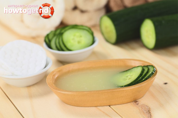 - Filtrer le bouillon à base de plantes à travers 4 couches de gaze, mélanger l'infusion avec du jus d'agrumes et de concombre. Versez la glycérine liquide, transférez le contenu dans un flacon hermétiquement fermé.