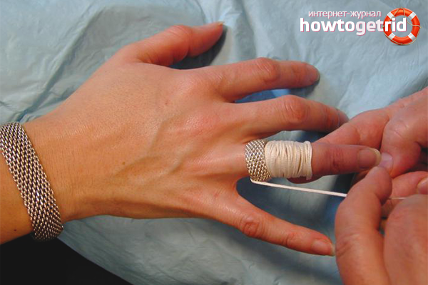 Vos actions: prenez un fil (de préférence en soie ou dentaire), tirez une extrémité à travers l'anneau, l'autre enrouler autour de votre doigt jusqu'à l'articulation de flexion. Tirez l'extrémité du fil qui a été enfilé sous l'anneau; dans le sens du fil, l'anneau doit avancer lentement et en douceur vers l'extrémité du doigt.
