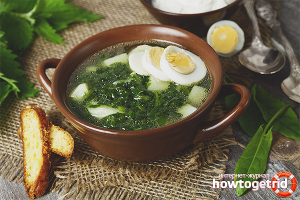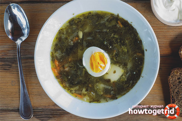 - En raison de la particularité, pour éliminer l'excès de liquide des tissus, la soupe est consommée pour éliminer les poches. Mais pour ne pas obtenir l'effet inverse, il est recommandé de s'appuyer sur le plat le midi. De plus, l'oseille est capable de tuer les micro-organismes nuisibles, désinfectant ainsi les organes internes.