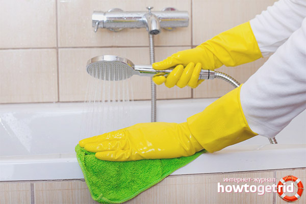 - La salle de bain doit être soigneusement nettoyée avec la solution résultante à l'aide d'une éponge, en accordant une attention particulière à toutes les irrégularités et les virages de la salle de bain. Après le nettoyage, laissez la solution rester sur la surface pendant 15 minutes.